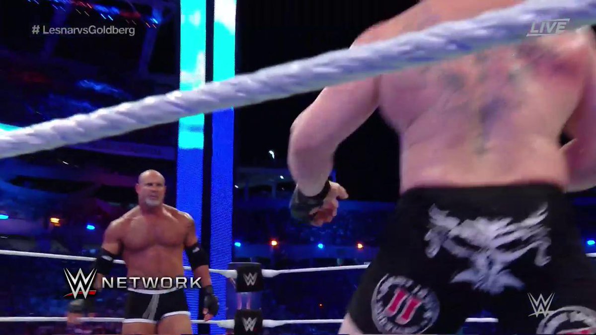Lesnar began the blockbuster battle with a trifecta of Germans before Goldberg hit back with a string of spears, which ended in them both crashing through the barricade.